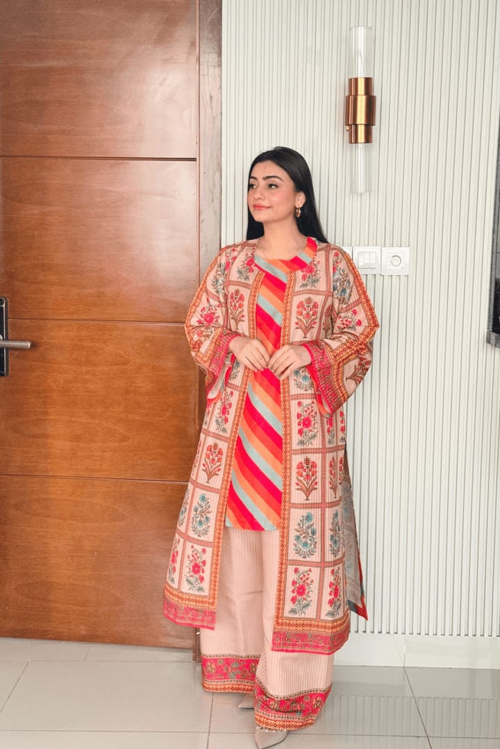 Embrace vibrant sophistication with Coral Dusk, a radiant 3-piece set that redefines modern elegance. The ensemble features a striped multicolor shirt paired with a delicately printed long jacket, adding a touch of artistic charm. Soft peach trousers complete the look with intricate border detailing—perfect for daytime events, brunches, or festive soirées.