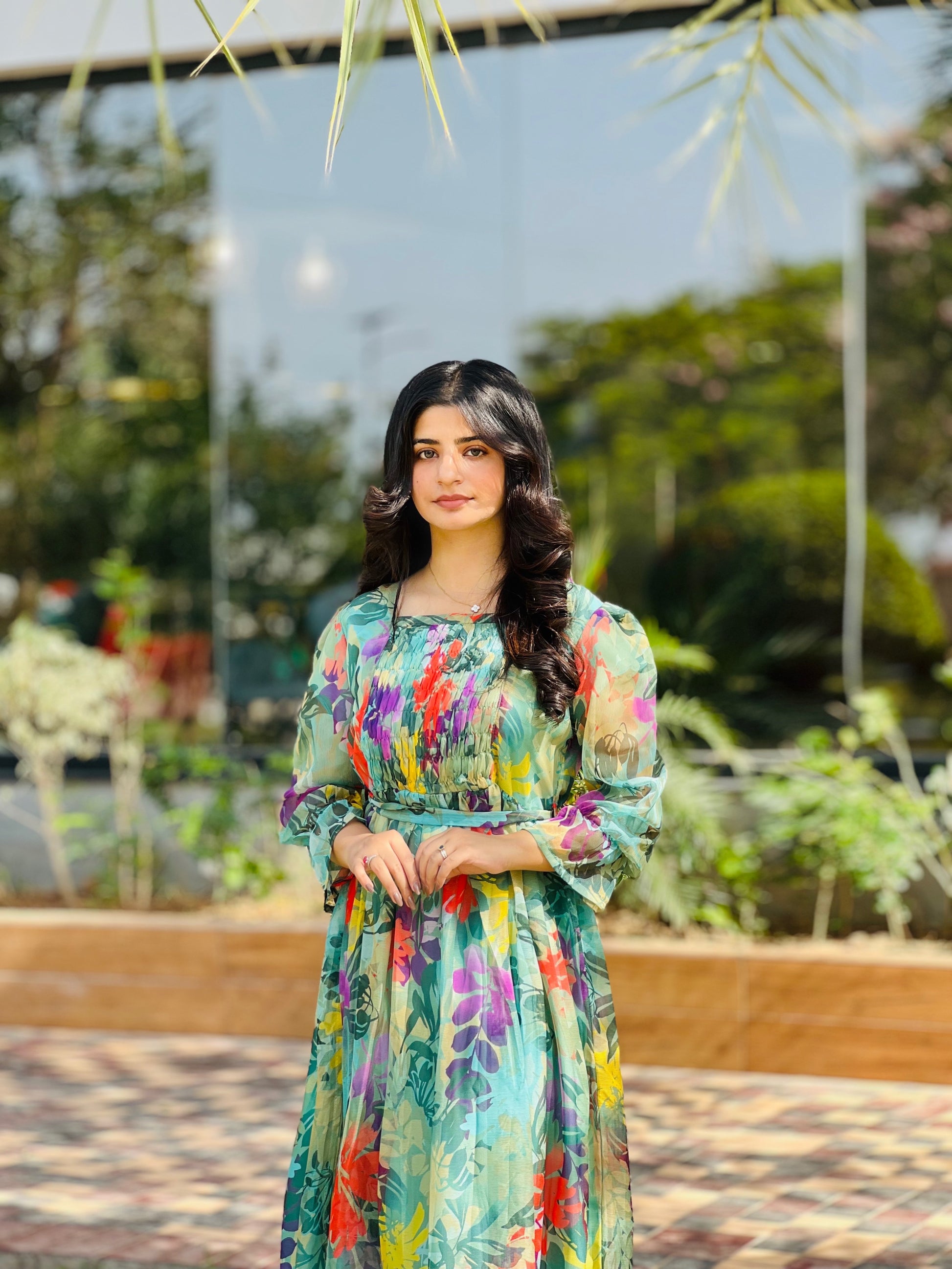 Step into summer elegance with our Tropical Bloom Maxi Dress. Crafted from lightweight chiffon fabric, this flowy maxi features a vibrant floral print in bold, refreshing hues. The soft elastic waist and balloon sleeves add a touch of femininity, making it perfect for brunches, garden parties, or casual outings. Pair it with sandals or heels for a graceful, effortless look.