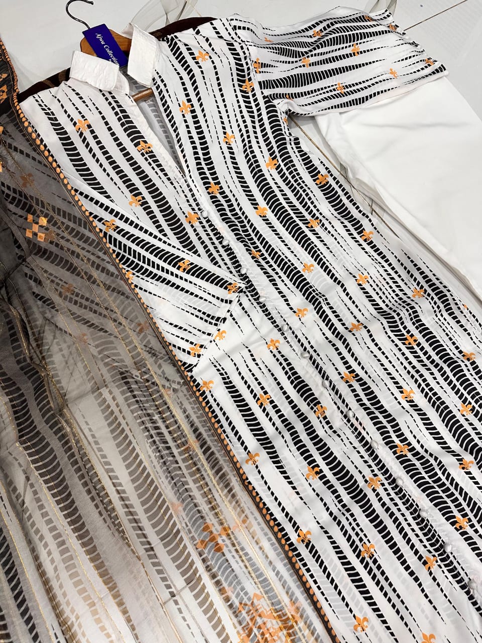 A statement in effortless elegance, this 3-piece set features a long printed shirt with front button detailing, paired with a plain crepe trouser and a diaphanous Monar Lawn dupatta adorned in golden patterns. Perfect for refined gatherings or day-to-evening transitions, it embodies the charm of minimal glamour with a modern touch.