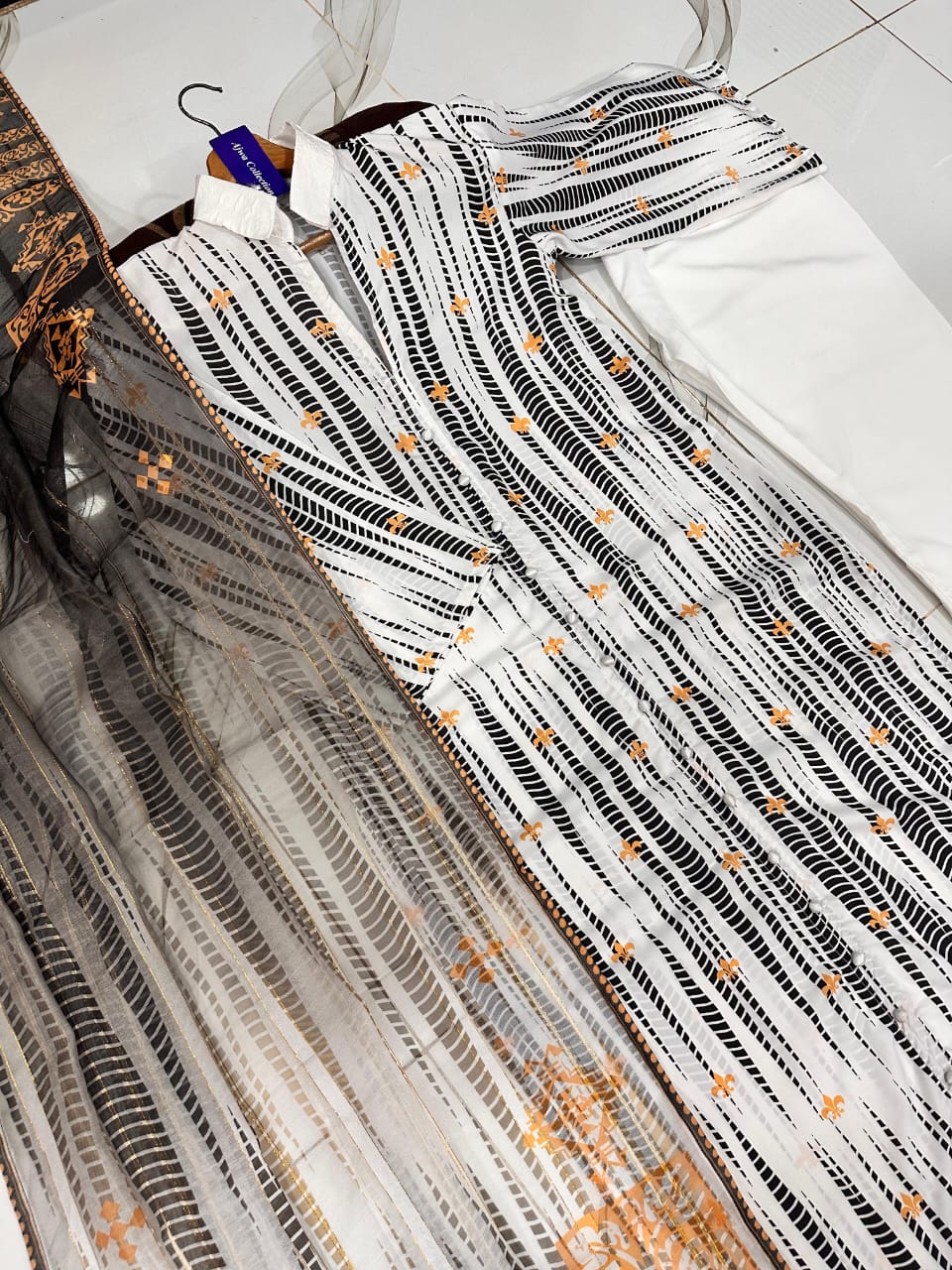 mmerse yourself in the calm sophistication of Golden Swiss Aura — a serene blend of artistry and allure. The white Swiss crepe base flows gracefully with digital tie & dye lines in bold black, gently kissed by golden motifs that shimmer with understated opulence.