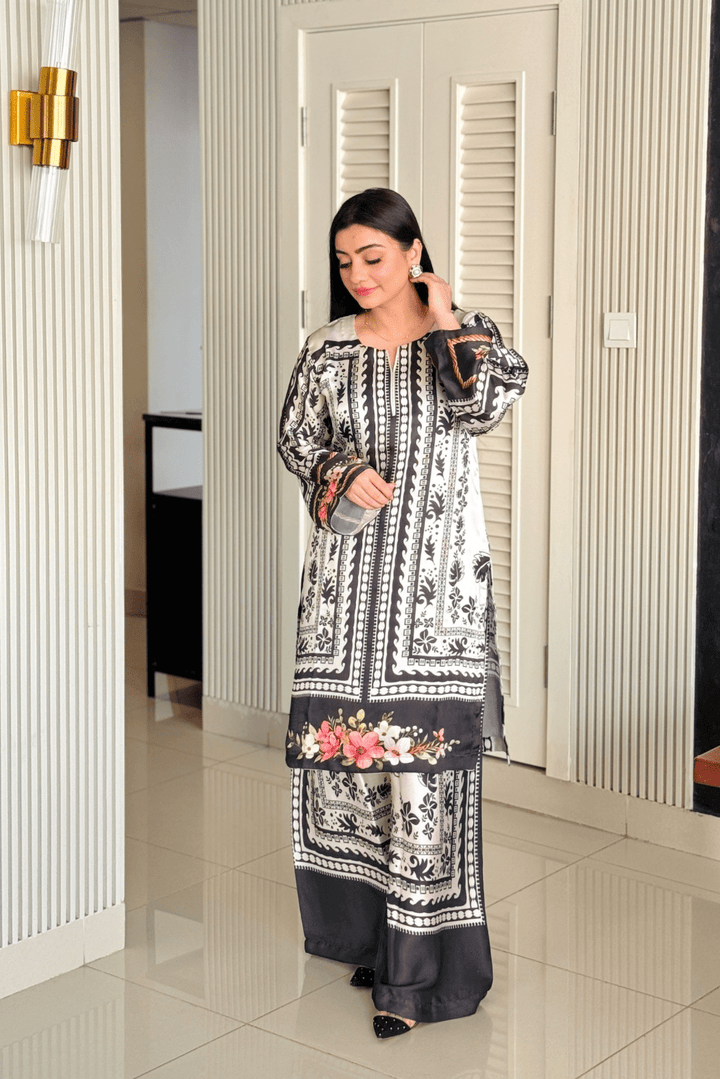 Step into elegance with Digital Poly Lawn Set, featuring a striking combination of monochrome patterns in rich black over a soft beige base. Crafted from breathable poly lawn fabric, this stitched 2-piece outfit offers both comfort and sophistication. The shirt showcases a bold digital print with floral and geometric elements, complemented by wide-leg trousers adorned with matching motifs. Perfect for semi-formal gatherings or a stylish day out, this ensemble blends tradition with modern flair.